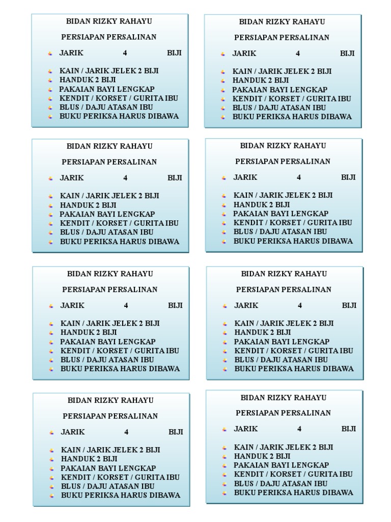 Berbagai Persiapan Menjelang Persalinan. Perencanaan kelahiran mencakup apa saja kebutuhan menjelang selama dan sesudah persalinan. Ya penting bagi Ibu untuk membawa data pribadi seperti KTPSIM dan Kartu Keluarga.